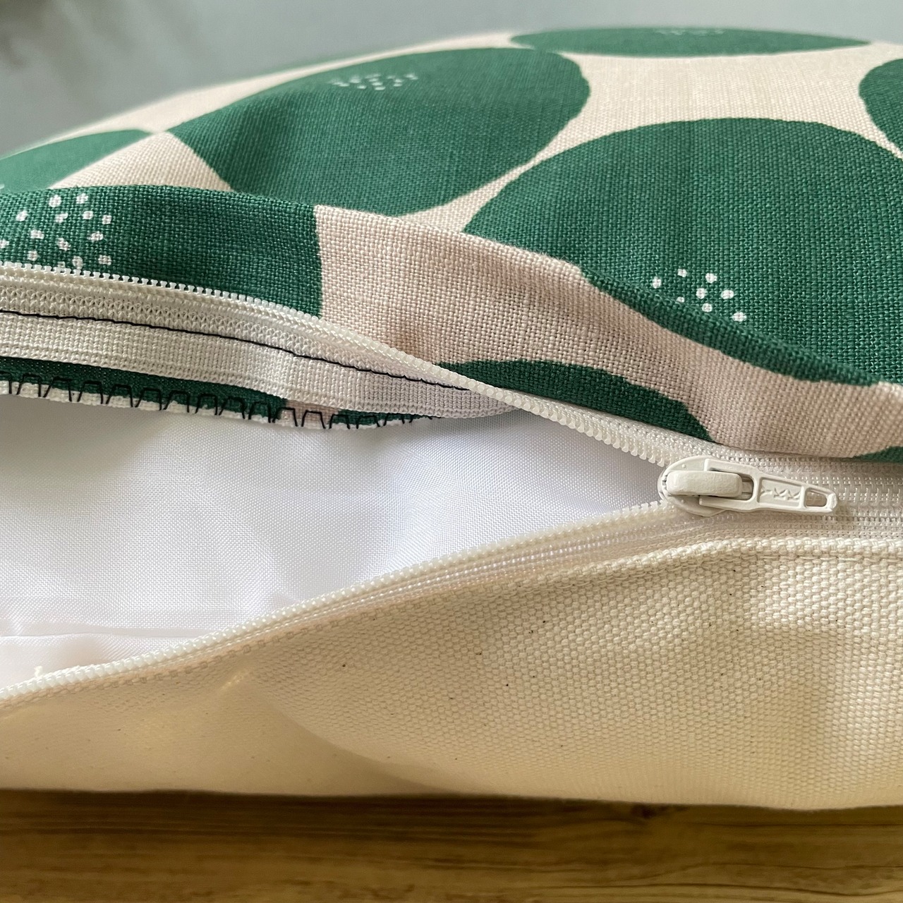 ファスナーは表から見えないように縫い付けており、スッキリとした形や、柄が綺麗に見えるように作っております。
